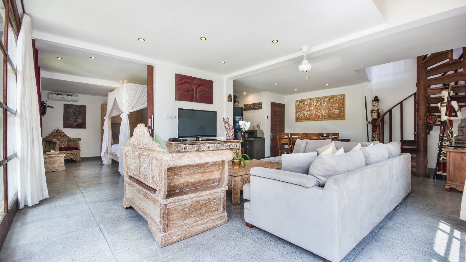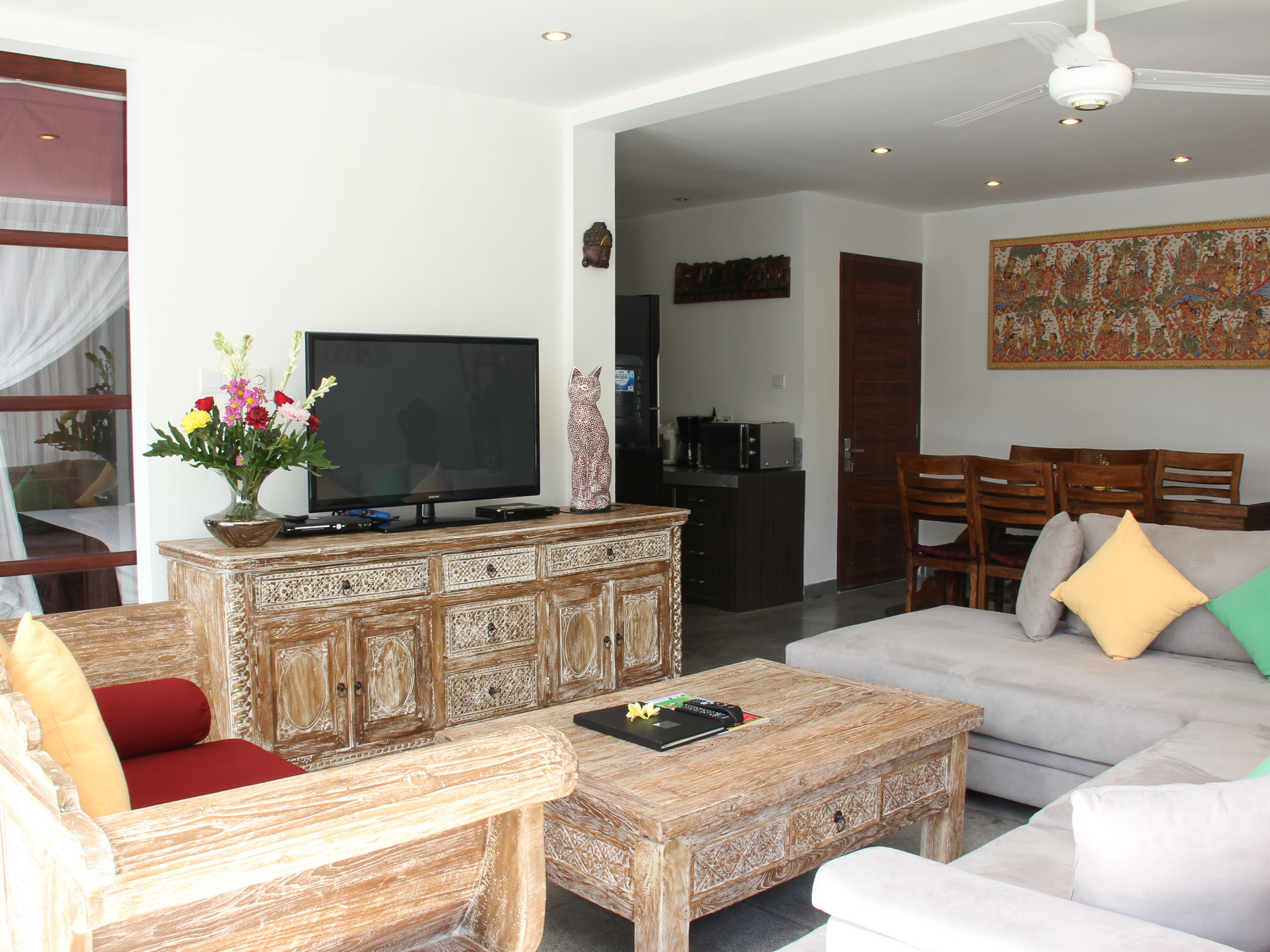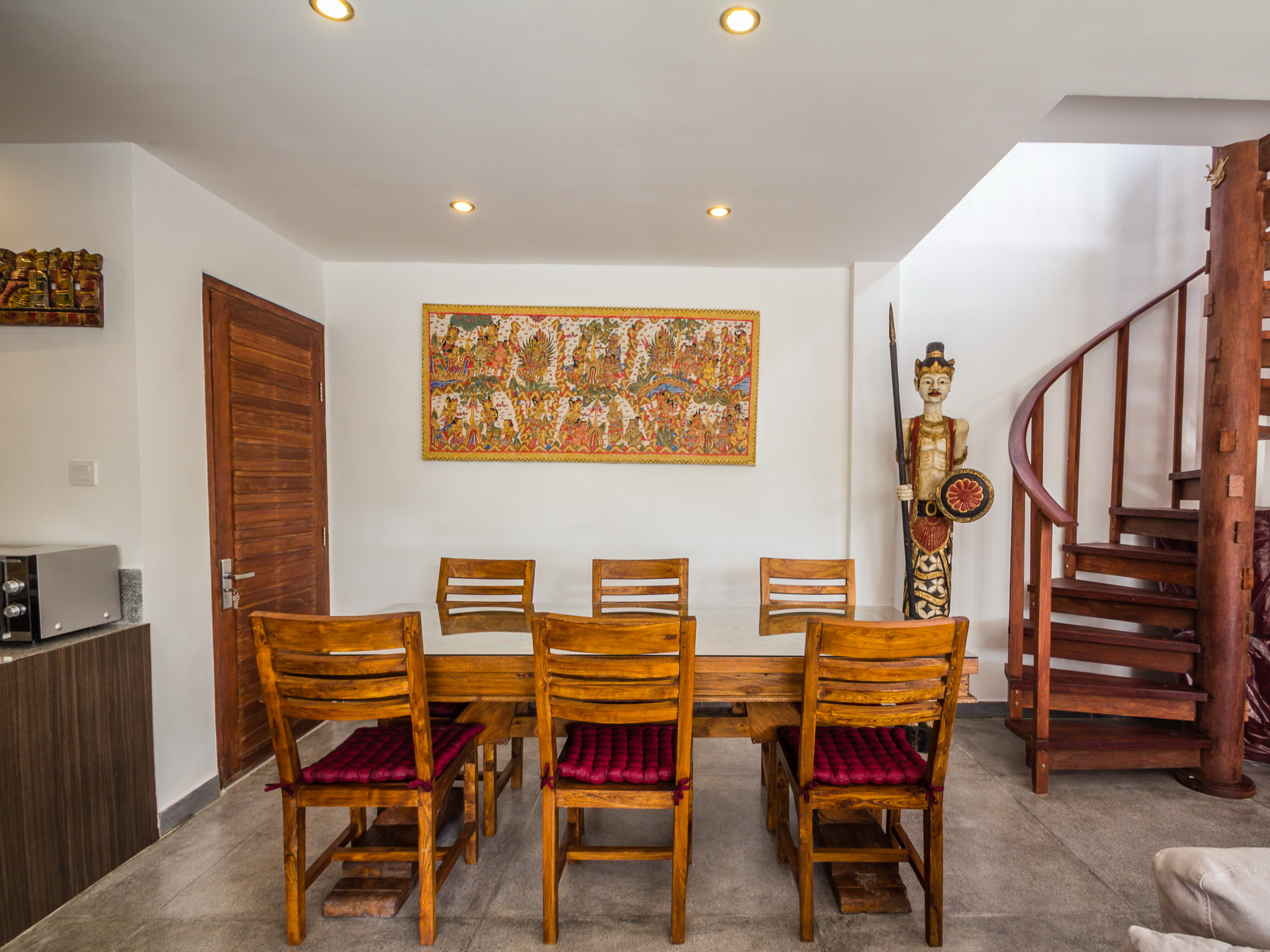The light-filled living room is designed with full length glass sliding doors, giving easy access to the garden and pool, for a true tropical lifestyle experience. The living room is furnished with a beautiful hand-carved Balinese sofa as well as a modern plush L-shaped sofa to curl up on, perfect for enjoying a cup of coffee in the morning, allowing the friendly morning sun to warm you up slowly until you are ready for your first dive into the refreshing water of the pool. In the evening this is the villa's communal hang-out spot to watch a movie altogether on the big flat-screen television with international channels and a DVD-player. More to the back there is a glass-topped, hand-carved dining table, crafted from reclaimed wood, allowing up to 6 people to have dinner together or enjoy the freshly made complimentary breakfast that will be served to you every morning by the friendly staff of villa Bewa. The open-kitchen is fully equipped with everything your holiday home needs.