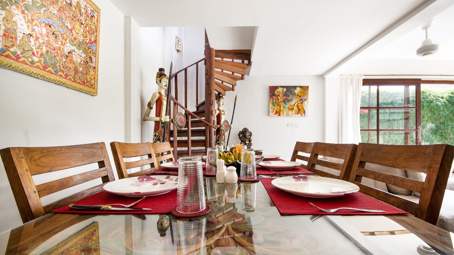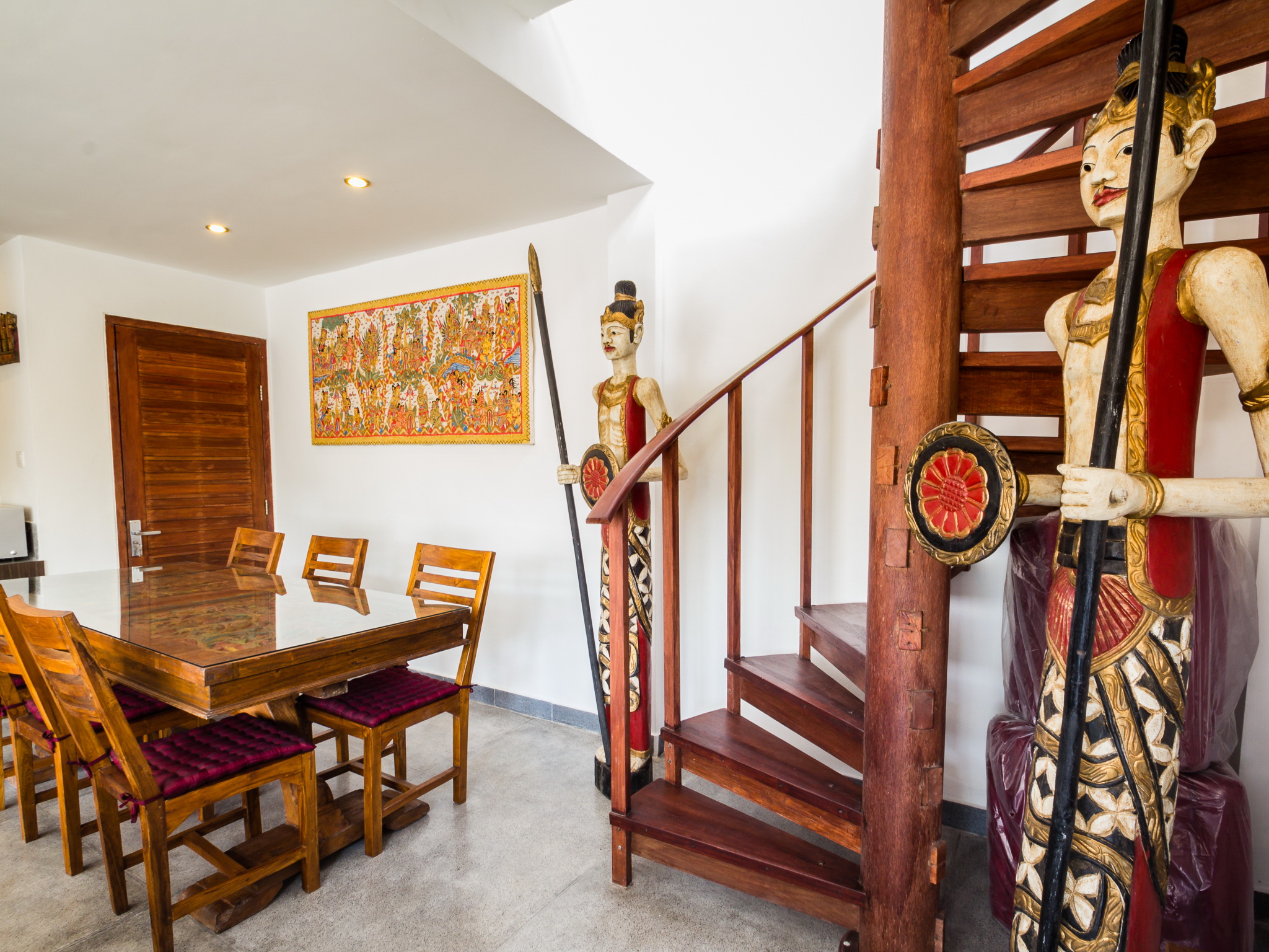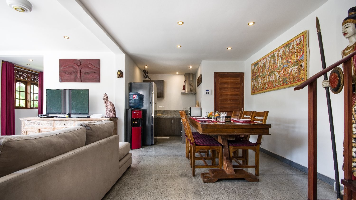 The light-filled living room is designed with full length glass sliding doors, giving easy access to the garden and pool, for a true tropical lifestyle experience. The living room is furnished with a beautiful hand-carved Balinese sofa as well as a modern plush L-shaped sofa to curl up on, perfect for enjoying a cup of coffee in the morning, allowing the friendly morning sun to warm you up slowly until you are ready for your first dive into the refreshing water of the pool. In the evening this is the villa's communal hang-out spot to watch a movie altogether on the big flat-screen television with international channels and a DVD-player. More to the back there is a glass-topped, hand-carved dining table, crafted from reclaimed wood, allowing up to 6 people to have dinner together or enjoy the freshly made complimentary breakfast that will be served to you every morning by the friendly staff of villa Bewa. The open-kitchen is fully equipped with everything your holiday home needs.
