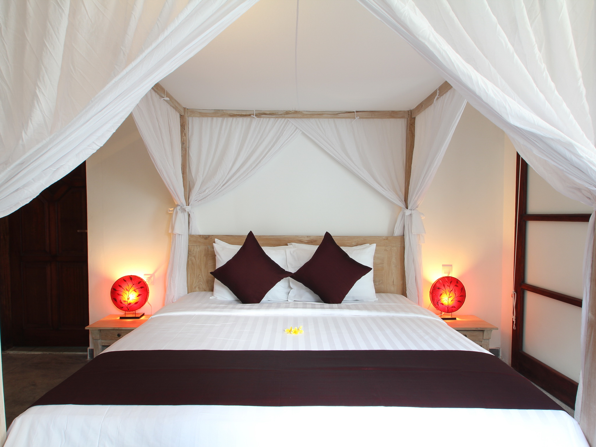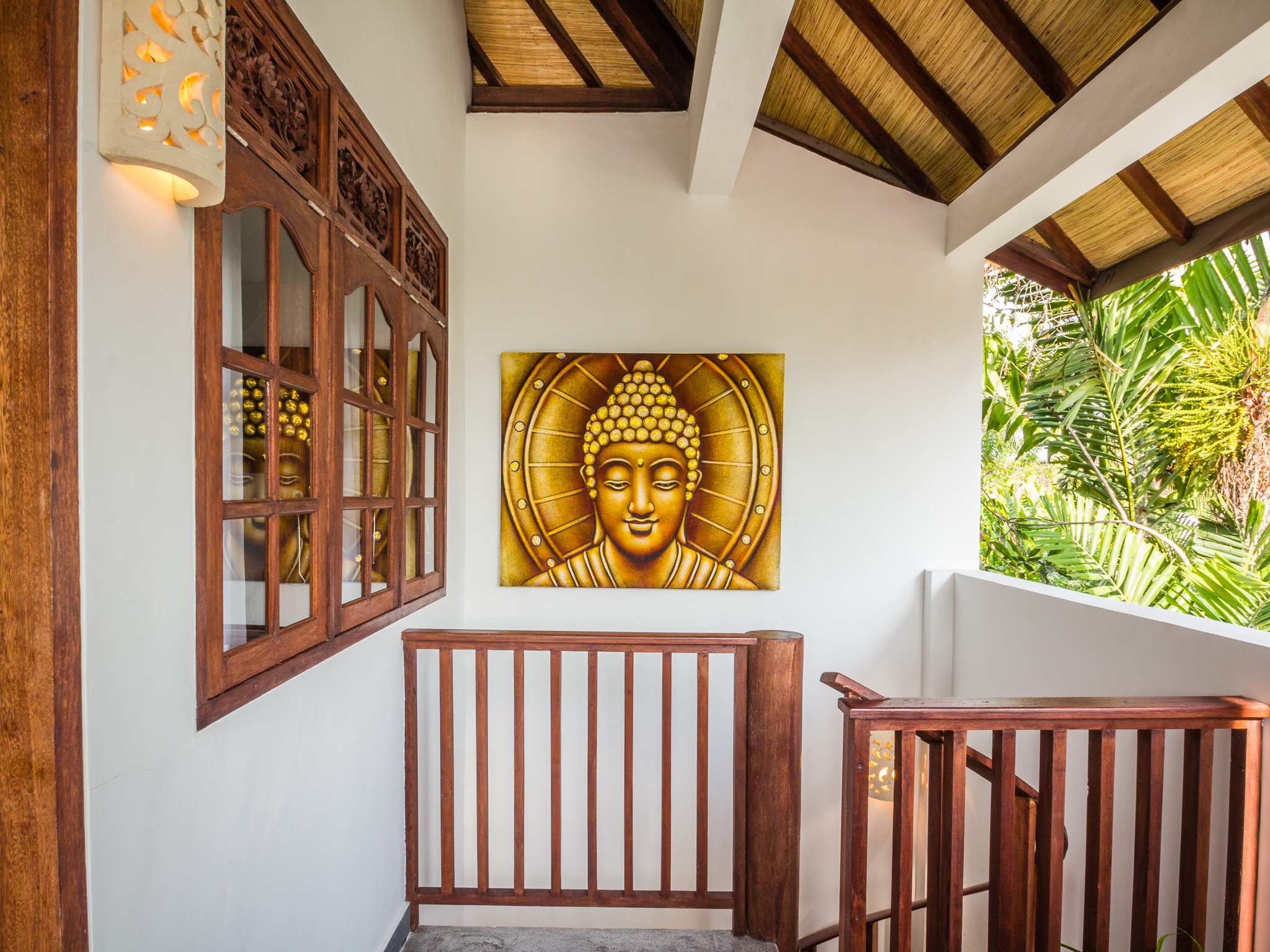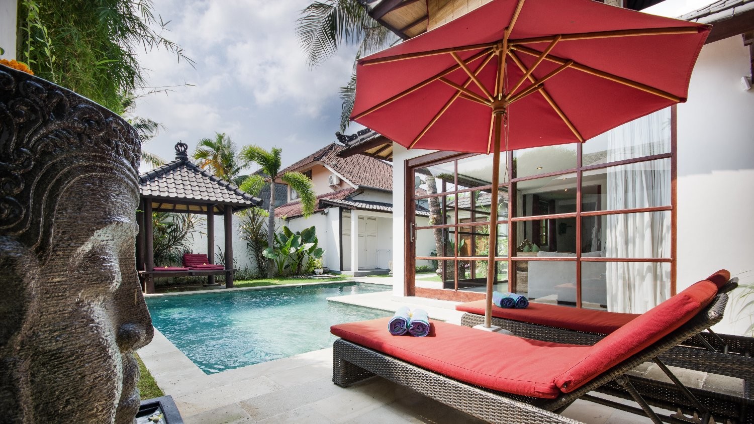 You are welcomed in the peaceful walled garden of the villa, planted with lots of tropical plants and towering trees. The glistering L-shaped swimming pool is encompassed by a palimanan stone veranda furnished with sun-loungers where you can laze the day away, sunbathing to the sound of rippling water from the Buddha-faced waterfall-feature or reading a book in the shade of the big red parasol. The day-bedded gazebo, tucked in the corner of the garden, is just perfect for indulging a traditional Balinese massage in the comfy ambiance of your own holiday home to feel reborn again.
