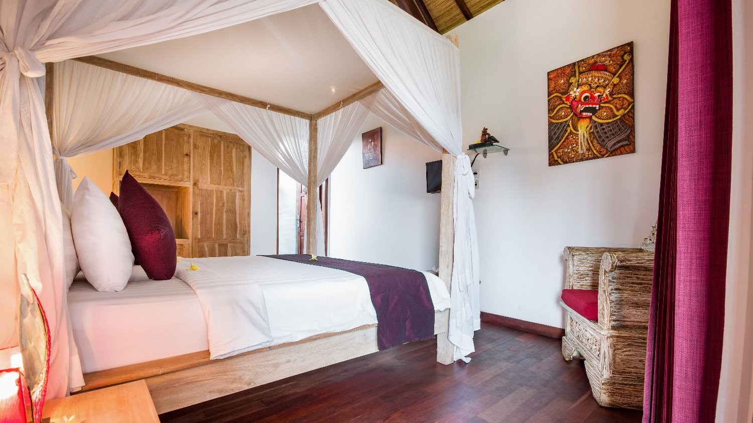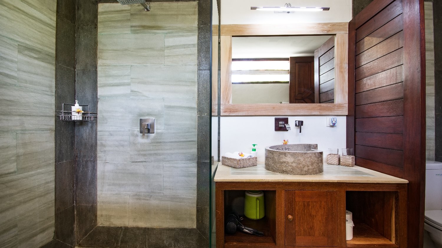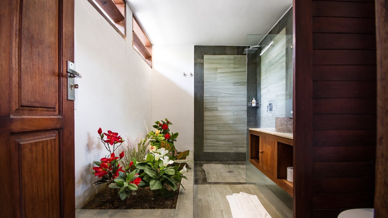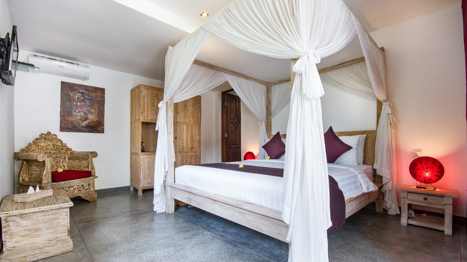 You are welcomed in the peaceful walled garden of the villa, planted with lots of tropical plants and towering trees. The glistering L-shaped swimming pool is encompassed by a palimanan stone veranda furnished with sun-loungers where you can laze the day away, sunbathing to the sound of rippling water from the Buddha-faced waterfall-feature or reading a book in the shade of the big red parasol. The day-bedded gazebo, tucked in the corner of the garden, is just perfect for indulging a traditional Balinese massage in the comfy ambiance of your own holiday home to feel reborn again.