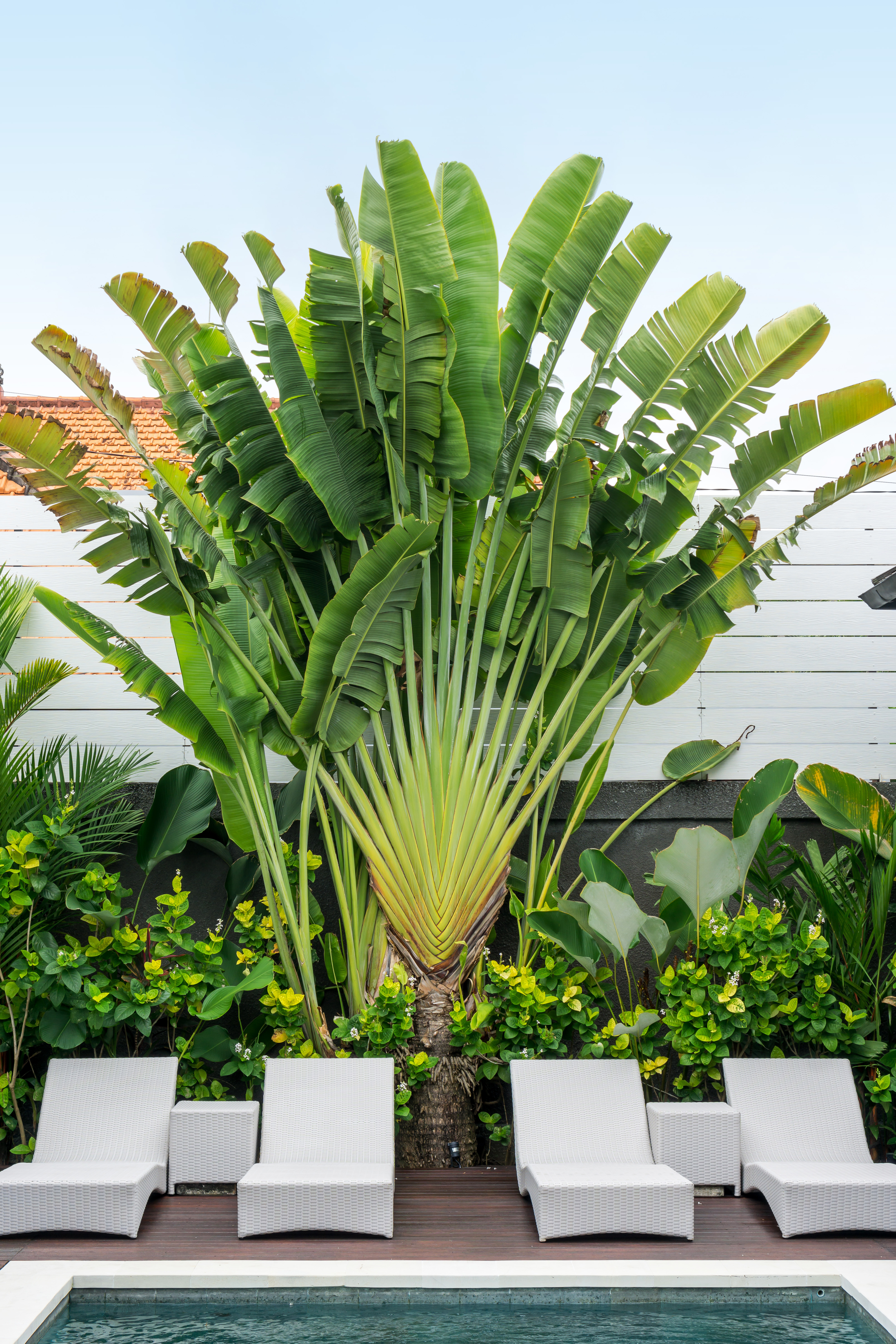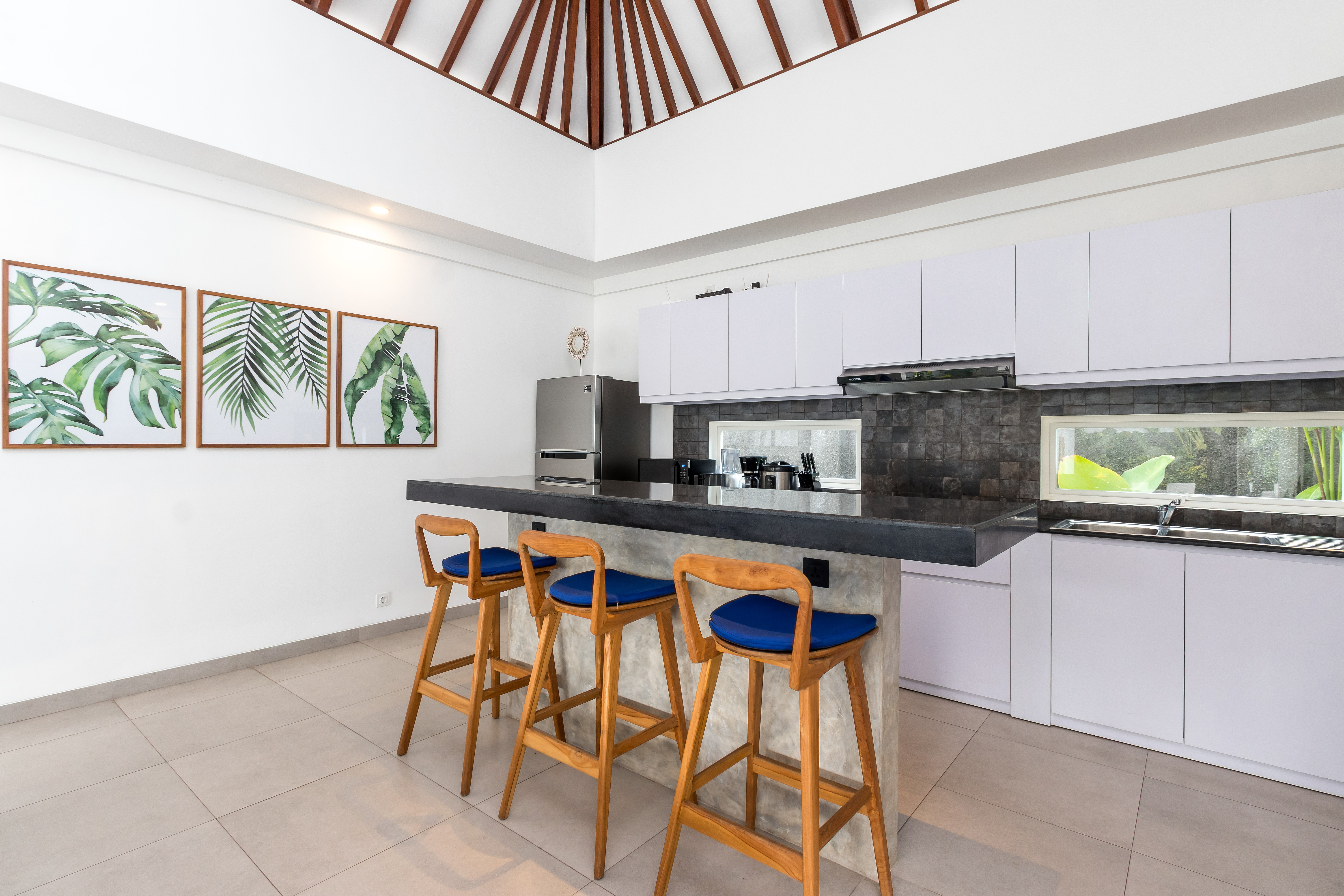 Behind those intercately-carved wooden doors at the entrance of Villa Hiburan 2 lies a private little peaceful paradise where the sun shines, the water glistens and open-plan living is combined with nice and cool air-conditioned sleeping quarters. Villa Hiburan 2 is a splendid private 3-bedroom holiday retreat with a great location in Batu Belig, close to the beach, shops, restaurants and cafe. Close to cosmopolitan Seminyak and close to laid-back Canggu, this villa is just where you want it to be: somewhere quiet in the heart of the action. Villa Hiburan 2 features a gorgeous, sunny garden with a most inviting private swimming pool to dip into. Lush palm trees grow around the garden wall at the back and the swimming pool is encompassed by a timber sun deck furnished with white rattan lounge beds. Large pool towelsare ready for your usage after a plunge in the pool, so what are you waiting for. The main pavilion features a traditional design with a high soaring rooftop and open-concept living room. Equipped with all modern comforts such as a sofa, dining table, TV and open kitchen with a bar and high chairs, living is good here at Villa Hiburan 2! The theme throughout the villa is tropical and inspired by the colour blue. The sofa lounge is dark blue, there are blue lamps mounted to the walls, the paintings are blue - this villa’s interior design is ruled by the colour blue, giving it a stylish look and spreading peaceful, serene vibes. The kitchen is very spacious and it comes with a microwave, toaster, coffee maker, electric stove and a large fridge. The island bar with wooden high chairs makes a lovely spot to sit down with drinks. The sofa is a comfy place to enjoy the garden view, watching the kids play in the pool or playing movies for some easy entertainment any time of the day of evening. The pool has got a shallow area for the kids, making it great for families and family fun under Bali’s tropical sun and clear blue sky.