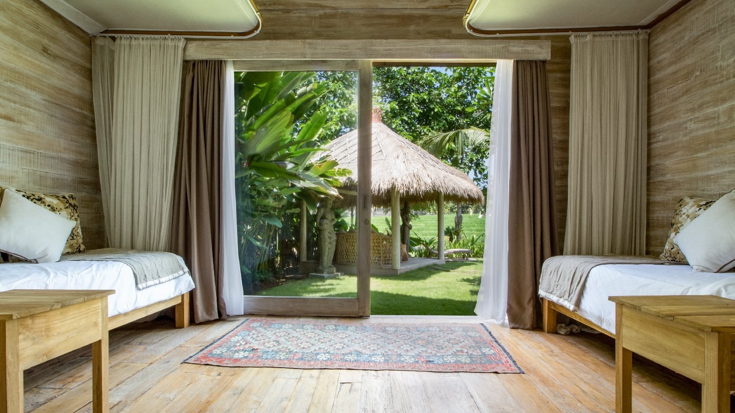 This bedroom has a four-post king-sized bed, twin beds as well as a dedicated bathroom with an indoor stone bathtub and both indoor and outdoor rain showers.
